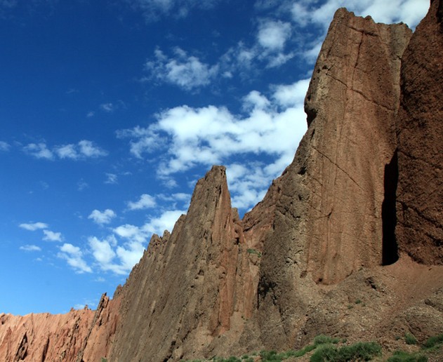 維吾爾語“克孜利亞”是“紅色的山崖”之意。神秘的“天山大峽谷”是天山支脈克孜利亞山中的一條峽谷,紅褐色巖石經(jīng)過大自然億萬年的風(fēng)刻雨蝕之下,才形成由現(xiàn)在“天山大峽谷”?!疤焐酱髰{谷”紅褐色的山體群直插云天,在陽光照射下,猶如一簇簇燃燒的火焰?!疤焐酱髰{谷”的迷人之處,不僅僅在于它的雄奇、險(xiǎn)峻,而在于它的幽深、寧靜和神秘。