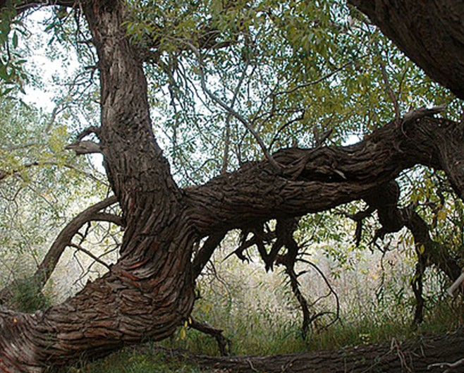 墓地周圍為戈壁荒丘,圓中卻以美麗奇特的大自然風(fēng)光、豐富多彩的植物資源、古樸淳厚的少數(shù)民族文化而享有盛譽(yù)。園中的樹(shù)木種類很多,有楊樹(shù)、榆樹(shù)、柳樹(shù)、白蠟樹(shù)、還有核桃、杏樹(shù)等。那些蒼勁的古樹(shù),有的曲折盤(pán)旋,貼地而伸;有的匍匐在地,猶如龍蛇之狀;有的軀干壯碩穩(wěn)固,枝條隨風(fēng)起舞;有的樹(shù)頭與根部相連,分不清哪是根,哪是枝;有的樹(shù)倒地后,又從根部生出新枝,筆直向上,長(zhǎng)成參天大樹(shù)。園中有一棵斜長(zhǎng)的大樹(shù),根部早已腐朽,而樹(shù)冠依然生機(jī)勃勃。園中最高大的一棵楊樹(shù),據(jù)資料介紹高96.23米,直徑6.25米。