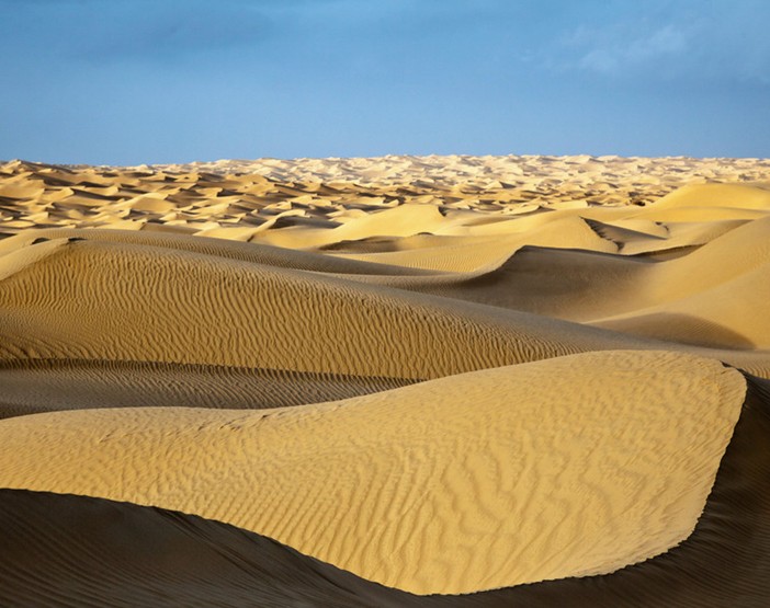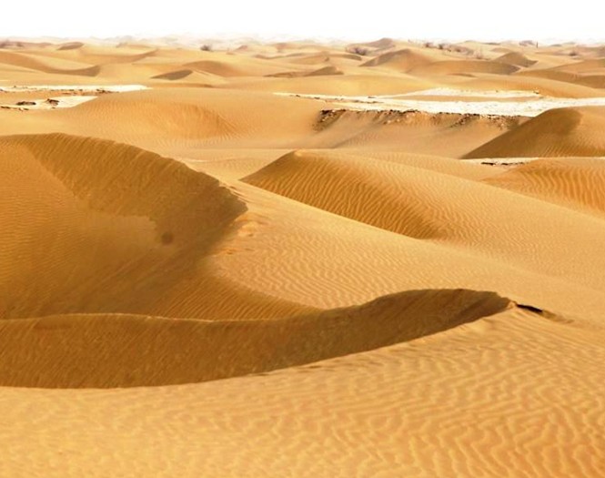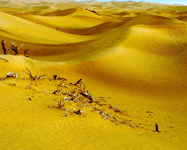 塔克拉瑪干沙漠位于中國(guó)新疆的塔里木盆地中央,是中國(guó)最大的沙漠,也是世界第九大沙漠,同時(shí)還是是世界最大的流動(dòng)性沙漠。整個(gè)沙漠東西長(zhǎng)約1000公里,南北寬約400公里,面積達(dá)33萬平方公里。平均年降水不超過100毫米,最低只有四五毫米;而平均蒸發(fā)量高達(dá)2500—3400毫米。這里,金字塔形的沙丘屹立于平原以上300米??耧L(fēng)能將沙墻吹起,高度可達(dá)其3倍。沙漠里沙丘綿延,受風(fēng)的影響,沙丘時(shí)常移動(dòng)。沙漠里亦有少量的植物,其根系異常發(fā)達(dá),超過地上部分的幾十倍乃至上百倍,以便汲取地下的水份;那里的動(dòng)物有夏眠的現(xiàn)象。