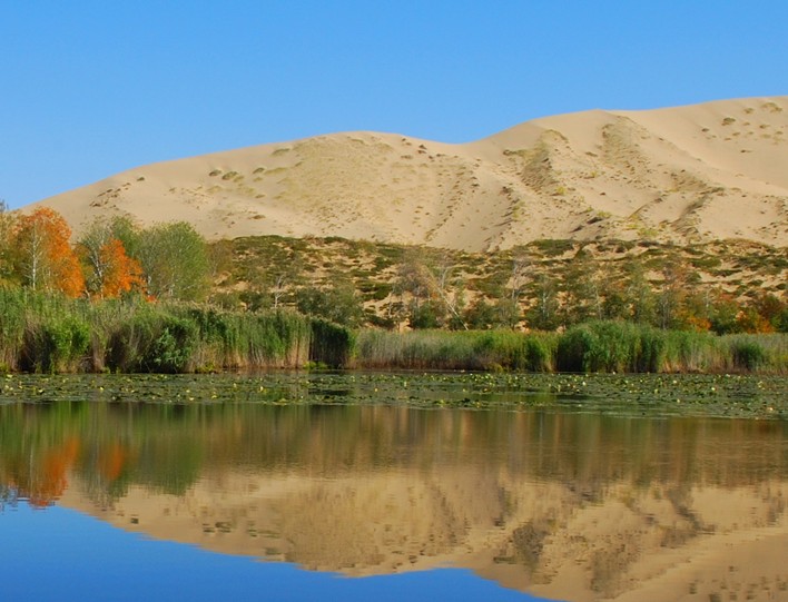 白沙湖,湖面只有0.5平方公里。是個(gè)獨(dú)立于浩瀚沙漠中的原生態(tài)沙漠湖,沒(méi)有進(jìn)水與出水口,沙漠里一般蒸發(fā)量都比較大,但這里的水位多年來(lái)卻沒(méi)有變化,更不因季節(jié)變遷而增多或減少。景致構(gòu)成十分獨(dú)特,湖中四周生長(zhǎng)著高達(dá)1—4米的密密叢生的蘆葦、菖蒲等水生植物,湖中還有野荷花孤寂地生存著;湖周50米內(nèi),是高大茂密的楊樹(shù)、白樺混生的林帶。