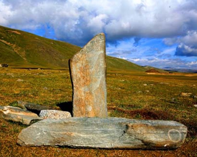 三海子墓葬及鹿石位于新疆維吾爾自治區(qū)青河縣查干郭愣鄉(xiāng)三海子夏牧場,為青銅時代的一處墓葬,距今約4000年。在面積約16.25平方公里地域的四個分布區(qū)內(nèi)計有石圍石堆墓、石棺墓30余座,鹿石19通。什巴爾庫勒石圍石堆墓,石堆直徑78米,殘高25米;石圍直徑210米,寬3~5米。石堆與石圍之間有四條片石鋪成的通道,最寬的通道達1.6米。墓環(huán)水而建,氣勢宏偉,結構獨特,是歐亞草原少有的特大規(guī)模墓冢之一。