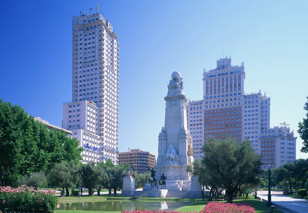 市內(nèi)現(xiàn)代化的高樓大廈與風格迥異的古建筑摩肩并立、相映生輝。樹林、草坪和各種造型別致的噴泉和雕有古代小亞細亞人尊崇的自然女神尼貝萊塑像噴泉最吸人入勝。宏偉的阿爾卡拉門坐落在阿爾卡拉街頭的獨立廣場上,共有5道拱門,是馬德里著名的古建筑之一。財政部、教育部和西班牙的主要銀行坐落在阿爾卡拉大街兩側(cè),建于1752年的王家美術(shù)學(xué)院收藏著牟利羅和戈雅等西班牙美術(shù)大師的名作。巍峨的塞萬提斯紀念碑聳立在西班牙廣場上,碑前有堂吉訶德和桑科•潘扎的塑像,巨大的碑身倒映在前面的水池之中,碑兩側(cè)是蔥郁的樹木;有“馬德里塔”之稱的西班牙摩天大廈位于廣場一側(cè)。