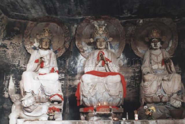 三壁三龕佛殿窟: 有南三、五、七、北三。窟分前廊后室(南七、北三)面闊為三間四柱,明間正中開窟門,次間各開大龕,龕內(nèi)雕踏山力士像,明間上部為印度式拱,次間額枋上為一斗三升拱。版權(quán)所有山東聊城聊之旅國(guó)際旅行社有限公司,轉(zhuǎn)載必究窟檐雕出仿木結(jié)構(gòu)建筑形式的滴水、圓椽、筒瓦等,瓦垅上有八層疊澀基,基上浮雕大型山花蕉葉覆蓋窟頂,大蕉葉擁托覆缽丘,丘上雕出象征塔剎的雙層火焰寶珠??邇?nèi)平面方形、穹隆頂,正、左、右壁各開帷幕帳形龕,龕內(nèi)雕一鋪三尊(南五)、五尊(南七)、七尊(北三)像,窟頂浮雕蓮花藻井及飛天伎樂,地面浮雕大蓮花,蓮花中間置博山爐(南五)窟門兩側(cè)刻大番卷草紋和連珠紋,上部刻飛天。