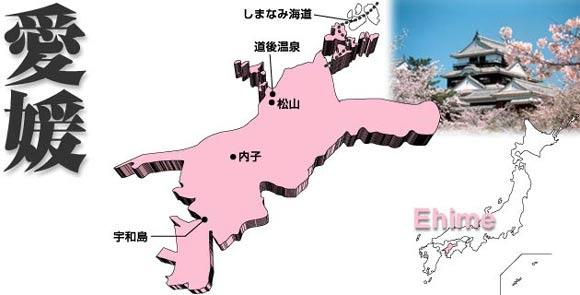 愛媛縣古稱伊予,位于四國西北部。北部偏東,南北走向細(xì)長。面積約5677平方公里,居全國第25位。人口約143萬,居全國第27位。愛媛縣氣候溫暖,得天獨厚。由于坡地較多,雨水較少,適宜于果樹園藝和畜牧業(yè)的發(fā)展。下轄11個市9町?,F(xiàn)任知事中村時廣,2010年12月當(dāng)選。