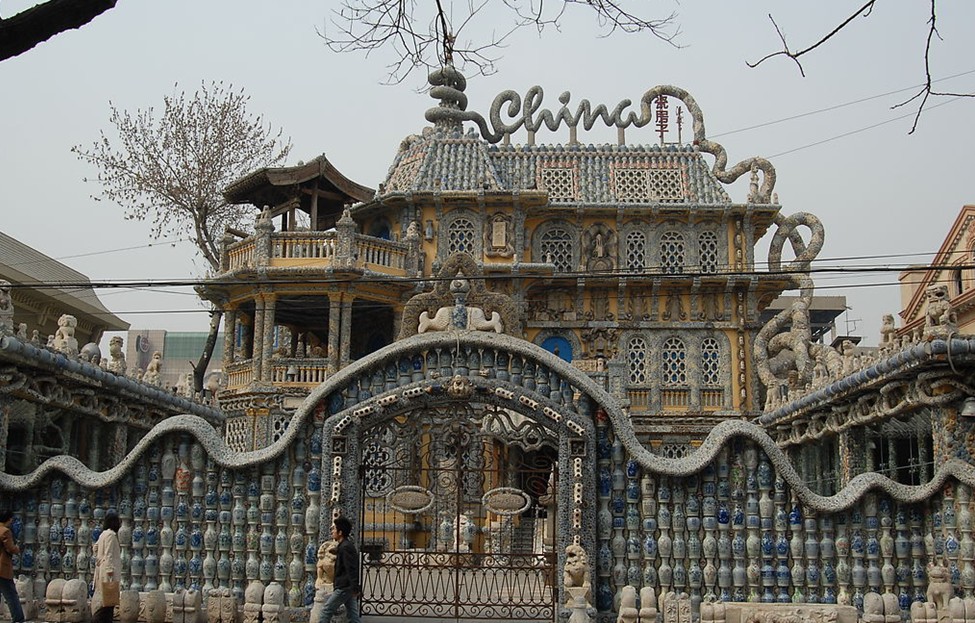 它將傳統(tǒng)元素與具有中國(guó)文化韻味的元素巧妙地糅合起來(lái),比如:圍墻是“平安墻”,用的是大小不一的瓷瓶粘貼,取諧音“瓶”安墻而來(lái)。石造像、漢白玉石雕會(huì)在恰當(dāng)?shù)臅r(shí)候與瓷片形成趣味組合,代表著時(shí)來(lái)運(yùn)轉(zhuǎn)(諧音“石”)。