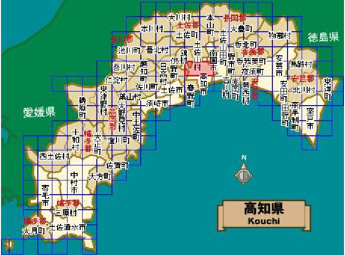 長(zhǎng)岡郡(ながおかぐん):本山町(もとやまちょう)、大豊町(おおとよちょう)。