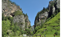 從卓尼縣城沿洮河向東,經(jīng)“石媳婦”(矗立于洮河岸邊的一座石峰)、博峪楊土司衙門遺址,便到大峪溝口的多壩村,向南沿林區(qū)公路進(jìn)大峪溝4公里,就到大峪河上的云江峽。云江峽猶如被縮小了的九巔峽,西壁高約百米,東壁高30~50米,峽長(zhǎng)500多米,其間石峰嵯峨,石門如屏,蒼松翠竹葳蕤,河水清冽碧綠,鳥(niǎo)鳴枝頭,魚(yú)翔淺底,可謂一幅絕妙的圖畫。