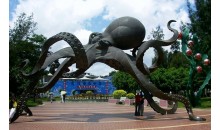 廈門海底世界占地17.5公頃,總建筑面積7500平方米。它是由新加坡華僑與鼓浪嶼風(fēng)景區(qū)建設(shè)開發(fā)公司合作興建的,總投資1000萬美元。這座花壇簇?fù)淼暮K{(lán)色水晶宮建筑,第一期工程先后建成了海洋館、企鵝和淡水魚館。其入口處在主體建筑外60米地方有一個設(shè)計獨特、別具一格、張牙舞爪的章魚雕,高6米、跨徑11.2米。它是廈門海底世界的標(biāo)志性建筑,也是游客們首先拍照留念的景觀。