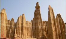 虎跳灘土林位于元謀縣城西北32公里的物茂鄉(xiāng)虎溪行政村,又稱物茂土林,芝麻土林,總面積2.3平方公里?;⑻鵀┩亮中螤钜猿潜?、屏風(fēng)狀、簾狀為主,高度一般10?15米,最高27米。